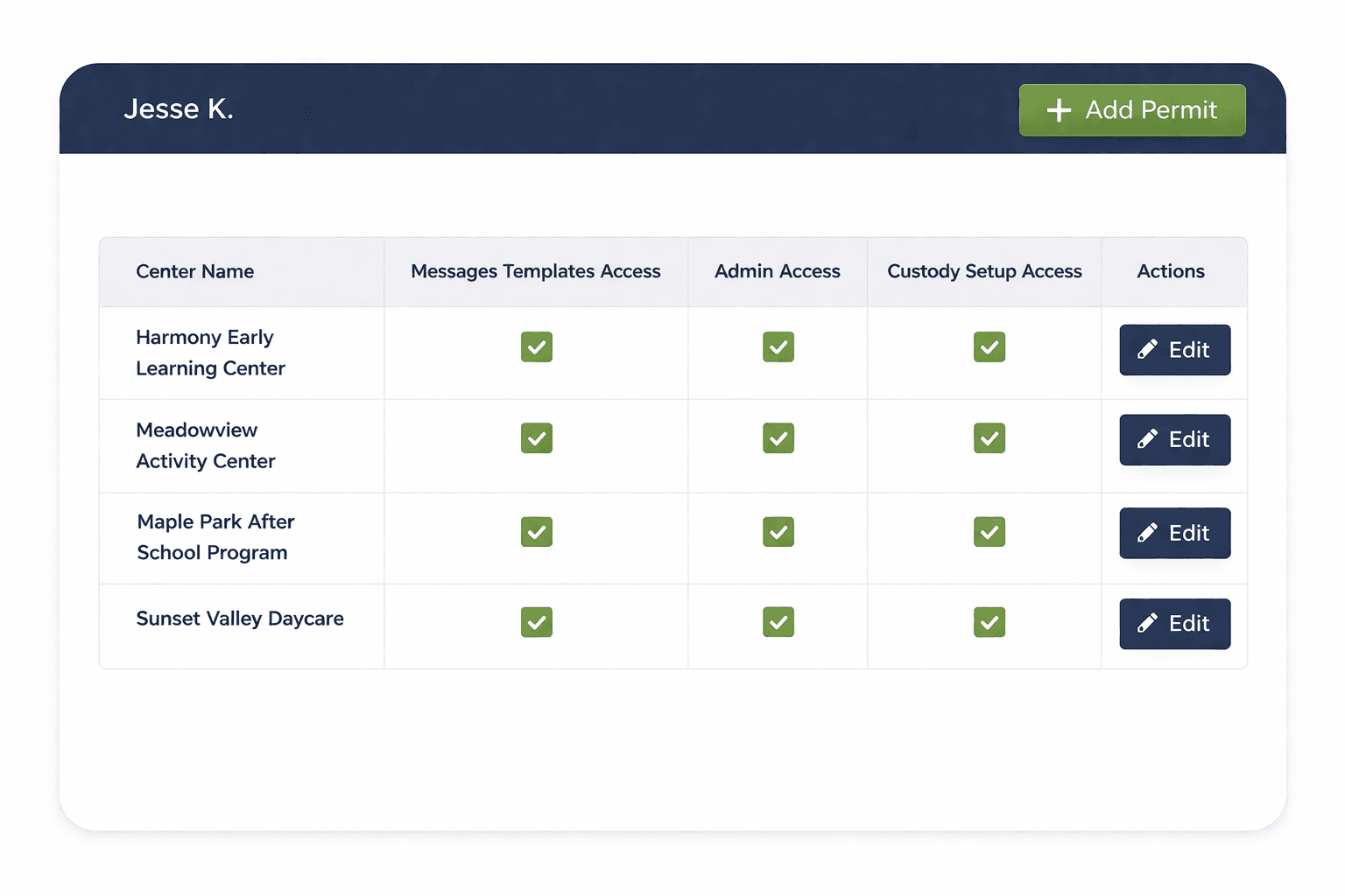 UpBup’s permits system gives you precise control over who can do what at each site. An admin can send messages at five locations but only edit templates at two. A teacher sees a read-only classroom view and receives messages — but can’t send them. Staff members see only their own forms and receive messages.